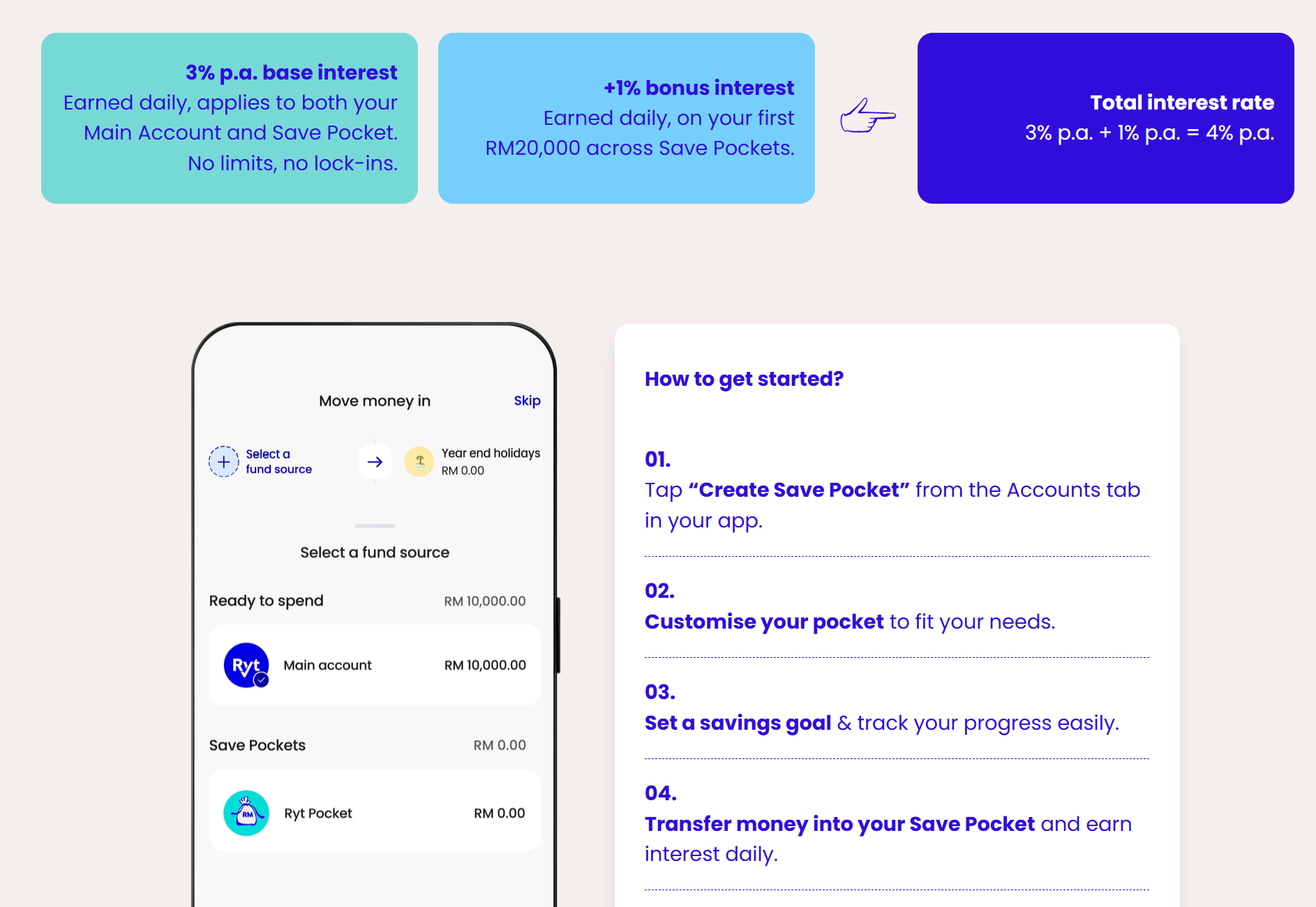 The balance in your main account (and any extra funds above RM20,000 in Save Pockets) will earn 3.00% pa (base rate) with no cap.