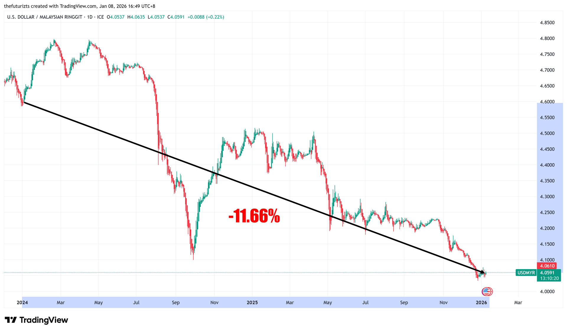 In 2025, the ringgit gained 10.15% versus the dollar, mainly because the US reduced interest rates and Malaysia’s strong economic fundamentals.